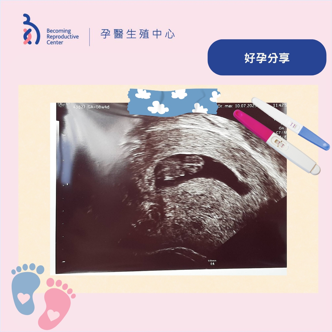 今年五月她回來使用賀爾蒙補充療法植入,在德國先服用雌激素藥物,返回「孕醫」後再調整劑量,終於在五月順利完成胚胎植入 後回去德國追蹤,目前她已懷孕八週看到胎兒心跳了💓!